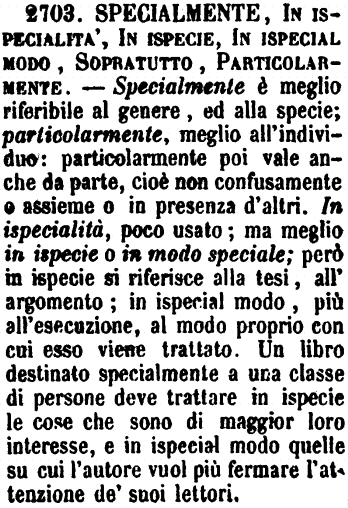 | Specialmente, In ispecialità, In ispecie, In ispecial modo, Sopratutto, Particolarmente - Specialmente è meglio riferibile al genere, ed alla specie; particolarmente, meglio all'individuo: particolarmente poi vale anche da parte, cioè non confusamente o assieme o in presenza d'altri. In ispecialità, poco usato; ma meglio in ispecie o in modo speciale; però in ispecie si riferisce alla tesi, all'argomento; in ispecial modo, più all'esecuzione, al modo proprio con cui esso viene trattato. Un libro destinato specialmente a una classe di persone deve trattare in ispecie le cose che sono di maggior loro interesse, e in ispecial modo quelle su cui l'autore vuol più fermare l'attenzione de' suoi lettori [immagine] |