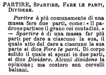 | Partire, Spartire, Fare le parti, Dividere - Partire è più comunemente di una massa fare due parti, come: «Il padrone partisce il grano coi contadini.» - Spartire è di una massa far più parti per dare a ciascuno la sua, il quale atto del dare a ciascuno la sua parte si dice Fare le parti. Di corpo solido il quale si spezzi in due parti, si dice Dividere. Alcuni dividono la opinione; ma costoro son cervelli balzani. [immagine] |
