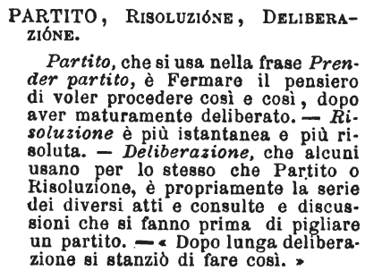 | Partito, Risoluzione, Deliberazione - Partito, che si usa nella frase Prender partito, è Fermare il pensiero di voler procedere così e così, dopo aver maturamente deliberato. - Risoluzione è più istantanea e più risoluta. Deliberazione, che alcuni usano per lo stesso che Partito o Risoluzione, è propriamente la serie dei diversi atti e consulte e discussioni che si fanno prima di pigliare un partito. - «Dopo lunga deliberazione si stanziò di fare così.» [immagine] |