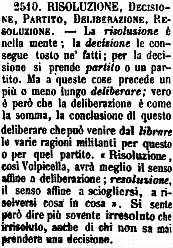 | Risoluzione, Decisione, Partito, Deliberazione, Resoluzione - La risoluzione è nella mente; la decisione le consegue tosto ne' fatti; per la decisione si prende partito o un partito. Ma a queste cose precede un più o meno lungo deliberare; vero è però che la deliberazione è come la somma, la conclusione di questo deliberare che può venire dal librare le varie ragioni militanti per questo o per quel partito. «Risoluzione, così Volpicella, avrà meglio il senso affine a deliberazione; resoluzione, il senso affine a sciogliersi, a risolversi cosa in cosa». Si sente però dire più sovente irresoluto che irrisoluto, anche di chi non sa mai prendere una decisione. [immagine] |
