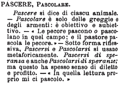| Pascere, Pascolare - Pascere si dice di ciascu animale. - Pascolare è solo delle greggie e degli armenti: è obiettivo e subiettivo. - «Le pecore pascono o pascolano in quel campo; e il pastore pascola le pecore.» - Sotto forma riflessiva, Pascersi e Pascolarsi si usano metaforicamente. Pascersi di speranza e anche Pascolarsi di speranze; ma questo ha spesso senso di diletto e profitto. - «In quella lettura proprio mi ci pascolo.» [immagine] |
