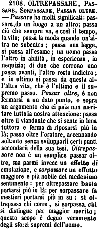 | Oltrepassare, Passare, Sorpassare, Passar oltre - Passare ha molti significati: passare da un luogo a un altro; passa ciò che sempre va, e così il tempo, la vita; passa la moda quando un'altra ne subentra; passa una legge, si passa all'esame; un uomo passa l'altro in abilità, in esperienza, in nequizia; di due che corrono uno passa avanti, l'altro resta indietro; e in ultimo si passa da questa all'altra vita, che è l'ultimo e il supremo passo. Passar oltre, è non fermarsi a un dato punto, o sopra un argomento che ci paia non meritare tutta la nostra attenzione: passa oltre il viandante che si sente in lena tuttora e ferma di riposarsi più in là; passa oltre l'oratore, accennando soltanto senza svilupparli certi punti secondarii della sua tesi. Oltrepassare non è un semplice passar oltre, ma parmi invece un effetto di emulazione, e sorpassare un effetto maggiore e più nobile del medesimo sentimento: per oltrepassare basta portarsi più in là: per sorpassare fa mestieri portarsi più in su: si oltrepassa chi corre, si sorpassa chi si distingue per maggior merito; questo scopo è degno veramente degli sforzi supremi dell'uomo. [immagine] |