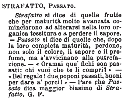 | Strafatto, Passato - Strafatto si dice di quelle frutte che per maturità molto avanzata cominciarono ad alterarsi nella loro organica tessitura e a perdere il sapore. - Passato si dice di quelle che, dopo la loro completa maturità, perdono, non solo il colore, il sapore e il profumo, ma s'avvicinano alla putrefazione. - « Oramai que' fichi son passati: chi vuoi che te li compri? » - « Bel regalo! due poponi passati, buoni per dare a' porci! » - Pare che Passato dica maggior biasimo di Strafatto. G. F. [immagine] |