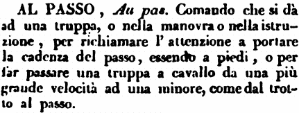 | Al passo - Au pas. Comando che si dà ad una truppa, o nella manovra o nella istruzione, per richiamare l'attenzione a portare la cadenza del passo, essendo a piedi, o per far passare una truppa a cavallo da una più grande velocità ad una minore, come dal trotto al passo. [immagine] |
