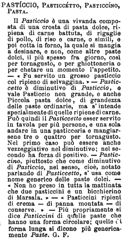 | Pasticcio, Pasticcetto, Pasticcino, Pasta - Il Pasticcio è una vivanda composta di una crosta di pasta dolce, ripiena di carne battuta, di rigaglie di pollo, di riso e carne, o simili, e poi cotta in forno, la quale si mangia a desinare, e non, come altre paste dolci, il più spesso fra giorno, così per tornagusto, o per ghiottoneria o per chetare un momento l'appetito. - « Fu servito un grosso pasticcio con ripieno di selvaggina. » - Pasticcetto è diminutivo di Pasticcio, e vale Pasticcio non grande, e anche Piccola pasta dolce, di grandezza delle paste ordinarie, ma s'intende specialmente di quelle ripiene di carne. Può quindi il Pasticcetto esser servito in tavola per più persone, e una sola andare in una pasticceria e mangiarsene tre o quattro per tornagusto. Nel primo caso può essere anche vezzeggiativo nel diminutivo; nel secondo ha forza di positivo. - Pasticcino, piuttosto che come diminutivo di Pasticcio, nel senso, cioè, notato parlando di Pasticcetto, s'usa come nome generico delle paste dolci. - « Non ho preso in tutta la mattinata che due pasticcini e un bicchierino di Marsala. » - « Pasticcini ripieni di crema - di panna montata - di conserve. » - Più propriamente si dice Pasticcini di quelle paste che hanno una forma circolare; quelle di forma lunga si dicono più genericamente Paste. G. F. [immagine] |