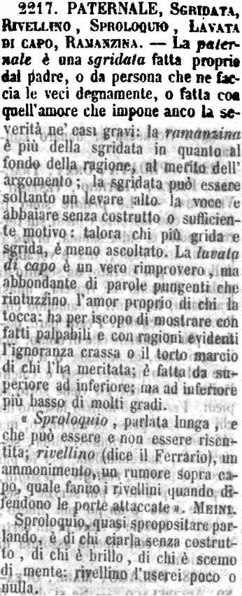 Paternale, Sgridata, Rivellino, Sproloquio, Lavata di capo, Ramanzina - La paternale è una sgridata fatta proprio dal padre, o da persona che ne faccia le veci degnamente, o fatta con quell'amore che impone anco la severità ne' casi gravi: la ramanzina è più della sgridata in quanto al fondo della ragione, al merito dell'argomento; la sgridata può essere soltanto un levare alto la voce e abbaiare senza costrutto o sufficiente motivo: talora chi più grida e sgrida, è meno ascoltato. La lavata di capo è un vero rimprovero, ma abbondante di parole pungenti che rintuzzino l'amor proprio di chi la tocca: ha per iscopo di mostrare con fatti palpabili e con ragioni evidenti l'ignoranza crassa o il torto marcio di chi l'ha meritata; è fatta da superiore ad inferiore; ma ad inferiore più basso di molti gradi.