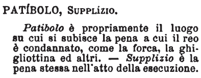 | Patibolo - S. m. Aff. al lat. aur. Patibulum. Si dice di Croce, Forche, e sim. dove altri patisce morte per esecuzione della giustizia. Red. Vip. 1. 30. (C) Poco avanti, che quelli infelici arrivassero al patibolo, una certa compassionevole e caritativa donnicciuola avea lor dato a mangiare un cedro.