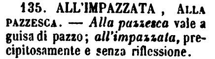 | All’impazzata, Alla pazzesca - Alla pazzesca vale a guisa di pazzo; all'impazzata, precipitosamente e senza riflessione. [immagine] |