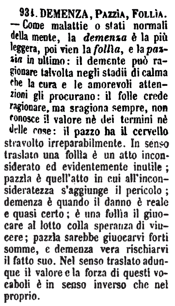| Demenza, Pazzia, Follia - Come malattie o stati normali della mente, la demenza è la più leggera, poi vien la follìa, e la pazzia in ultimo: il demente può ragionare talvolta negli stadii di calma che la cura e le amorevoli attenzioni gli procurano: il folle crede ragionare, ma sragiona sempre, non conosce il valore nè dei termini nè delle cose: il pazzo ha il cervello stravolto irreparabilmente. In senso traslato una follia è un atto inconsiderato ed evidentemente inutile; pazzìa è quell'atto in cui all'inconsideratezza s'aggiunge il pericolo; demenza è quando il danno è reale e quasi certo; è una follìa il giuocare al lotto colla speranza di vincere; pazzìa sarebbe giuocarvi forti somme, e demenza vera rischiarvi il fatto suo. Nel senso traslato adunque il valore e la forza di questi vocaboli è in senso inverso che nel proprio. [immagine] |