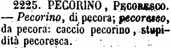 | Pecora, Pecoro, Pecorino, Pecoresco - La Pecora, nel proprio, è la femmina del Montone (Ovis Aries di Linneo), e non ha senso di biasimo nè di lode. Pecoro, sempre nel proprio, suona biasimo, dicendosi di pecora vecchia adoperata come cibo. - «Ma questo è pecoro bell'e buono! Altro che agnellino di latte!» - «In quell'osteria non trovò che un po' di pecoro da lasciarci dentro i denti e un vino da far morire, per la paura d'averlo a bere, un risuscitato.» - Nel traslato, d'animale mansueto, suol dirsi E' una pecora. - «Sul mio cavallo ci può montare anche un bambino: è proprio una pecora.» - D'animali soltanto pecora; d'uomini e Pecora e Pecoro, che ha l'accrescitivo Pecorone. Pecora di chi è timido o fiacco; Pecoro, di chi nella sua timidità o fiacchezza è sciocco e senza giudizio. - Pecorino vale Che appartiene alla pecora, Di pecora. - «Pelle - lana - cacio pecorino.» - Pecoresco, Che ha della pecora, sempre in mal senso. - «Stupidità - stoltezza - obbedienza pecoresca.» G. F. [immagine] |