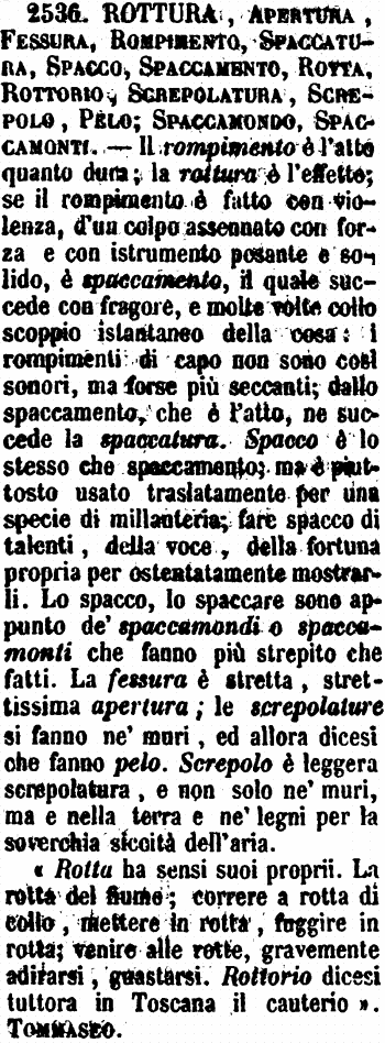 | Rottura, Apertura, Fessura, Rompimento, Spaccatura, Spacco, Spaccamento, Rotta, Rottorio, Screpolatura, Screpolo, Pelo; Spaccamondo, Spaccamonti - Il rompimento è l'atto quanto dura; la rottura è l'effetto; se il rompimento è fatto con violenza, d'un colpo assennato con forza e con istrumento pesante e solido, è spaccamento, il quale succede con fragore, e molte volte collo scoppio istantaneo della cosa: i rompimenti di capo non sono così sonori, ma forse più seccanti; dallo spaccamento, che è l'atto, ne succede la spaccatura. Spacco è lo stesso che spaccamento; ma è piuttosto usato traslatamente per una specie di millanteria; fare spacco di talenti, della voce, della fortuna propria per ostentatamente mostrarli. Lo spacco, lo spaccare sono appunto de' spaccamondi o spaccamonti che fanno più strepito che fatti. La fessura è stretta, strettissima apertura; le screpolature si fanno ne' muri, ed allora dicesi che fanno pelo. Screpolo è leggera screpolatura, e non solo ne' muri, ma e nella terra e ne' legni per la soverchia siccità dell'aria.