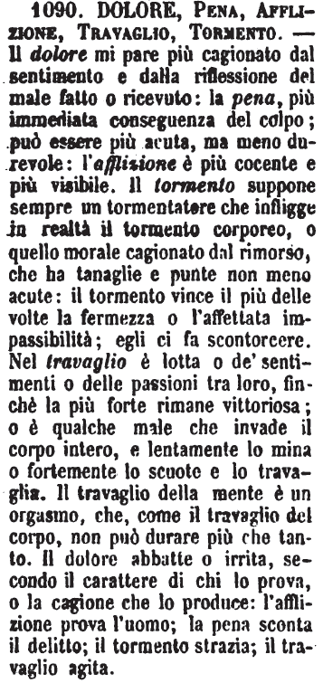 | Dolore, Pena, Afflizione, Travaglio, Tormento - Il dolore mi pare più cagionato dal sentimento e dalla riflessione del male fatto o ricevuto: la pena, più immediata conseguenza del colpo; può essere più acuta, ma meno durevole: l'afflizione è più cocente e più visibile. Il tormento suppone sempre un tormentatore che infligge in realtà il tormento corporeo, o quello morale cagionato dal rimorso, che ha tanaglie e punte non meno acute: il tormento vince il più delle volte la fermezza o l'affettata impassibilità; egli ci fa scontorcere. Nel travaglio è lotta o de' sentimenti o delle passioni tra loro, finchè la più forte rimane vittoriosa; o è qualche male che invade il corpo intero, e lentamente lo mina o fortemente lo scuote e lo travaglia. Il travaglio della mente è un orgasmo, che, come il travaglio del corpo, non può durare più che tanto. Il dolore abbatte o irrita, secondo il carattere di chi lo prova, o la cagione che lo produce: l'afflizione prova l'uomo; la pena sconta il delitto; il tormento strazia; il travaglio agita. [immagine] |
