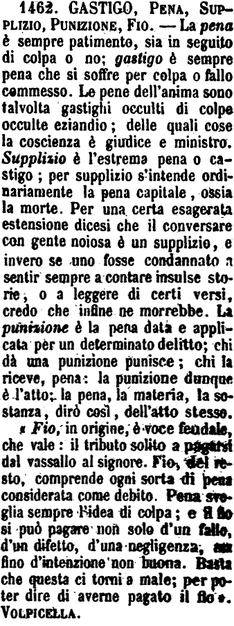 Gastigo, Pena, Supplizio, Punizione, Fio - La pena è sempre patimento, sia in seguito di colpa o no; gastigo è sempre pena che si soffre per colpa o fallo commesso. Le pene dell'anima sono talvolta gastighi occulti di colpe occulte eziandio; delle quali cose la coscienza è giudice e ministro. Supplizio è l'estrema pena o castigo; per supplizio s'intende ordinariamente la pena capitale, ossia la morte. Per una certa esagerata estensione dicesi che il conversare con gente noiosa è un supplizio, e invero se uno fosse condannato a sentir sempre a contare insulse storie, o a leggere di certi versi, credo che infine ne morrebbe. La punizione è la pena data e applicata per un determinato delitto; chi dà una punizione punisce; chi la riceve, pena: la punizione dunque è l'atto; la pena, la materia, la sostanza, dirò così, dell'atto stesso.