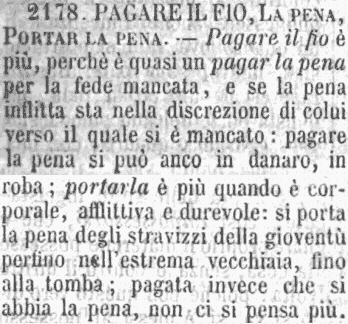 «Fio, in origine, è voce feudale, che vale: il tributo solito a pagarsi dal vassallo al signore. Fio, del resto, comprende ogni sorta di pena considerata come debito. Pena sveglia sempre l'idea di colpa; e il fio si può pagare non solo d'un fallo, d'un difetto, d'una negligenza, ma fino d'intenzione non buona. Basta che questa ci torni a male; per poter dire di averne pagato il fio».Volpicella. [immagine] |