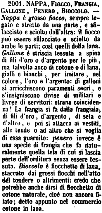 | Nappa, Fiocco, Frangia, Gallone, Penero, Bioccolo - Nappa è grosso fiocco, sempre legato e stretto da una parte, e sfilacciato e sciolto dall'altra: il fiocco può essere sfilacciato e sciolto da ambe le parti; così quelli della lana. Gallone è striscia tessuta a spina di fili d'oro o d'argento per lo più, ma talvolta anco di cotone o di lana, gialli e bianchi, per imitare, nel colore, l'oro e l'argento: di galloni si arricchiscono paramenti sacri, e s'insigniscono divise di militari e livree di servitori: strana coincidenza! La frangia si fa dalla frangiaia, di fili d'oro, d'argento, di seta e d'altro, e poi si attacca ai vestiti, alle tende o ad altro che si voglia di essa guarnito: penero invece è una specie di frangia che fa naturalmente quella tela di cui si lascia parte dell'orditura senza essere tessuta. Bioccolo è fiocchetto di lana, staccato dai grossi fiocchi nell'atto del tondere o altrimenti: credo che potrebbe anche dirsi di fiocchetto di cotone naturale, cioè non ancora filato; detto appunto nel commercio cotone in lana. [immagine] |