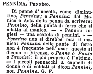 | Pennina, Pennino - Di penne d'uccelli, come diminutivo, Pennina; e Pennina del Manico o Asta della penna da scrivere; Pennino, della punta di ferro che si adatta al manico. - «Pennini inglesi - una scatola di pennini.» - Pennino non si direbbe mai il manico: Pennina delle punte di ferro non è frequente nell'uso; queste si dicono in Firenze, o Penne o Punte o Pennini: il più proprio è l'ultimo. - I piccoli pennacchi a cappelli di donne o di soldati si dicon Pennini, non Pennine. G. F. [immagine] |