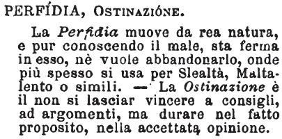 | Perfidia, Ostinazione - La Perfidia muove da rea natura, e pur conoscendo il male, sta ferma in esso, nè vuole abbandonarlo, onde più spesso si usa per Slealtà, Maltalento o simili.- La Ostinazione è il non si lasciar vincere a consigli, ad argomenti, ma durare nel fatto proposito, nella accettata opinione. [immagine] |