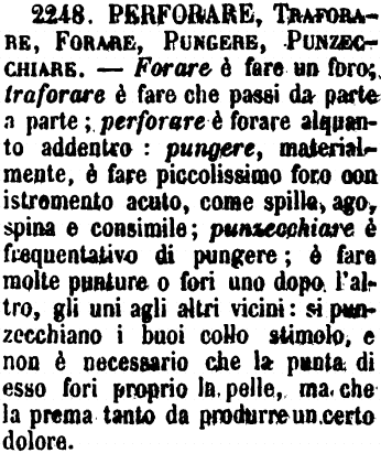 | Perforare, Traforare, Forare, Pungere, Punzecchiare - Forare è fare un foro; traforare è fare che passi da parte a parte; perforare è forare alquanto addentro: pungere, materialmente, è fare piccolissimo foro con istromento acuto, come spilla, ago, spina e consimile; punzecchiare è frequentativo di pungere; è fare molte punture o fori uno dopo l'altro, gli uni agli altri vicini: si punzecchiano i buoi collo stimolo, e non è necessario che la punta di esso fori proprio la pelle, ma che la prema tanto da produrre un certo dolore. [immagine] |