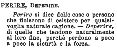 | Perire, Deperire - Perire si dice delle cose o persone che finiscono di esistere per qualsivoglia naturale cagione. - Deperire, di quelle che tendono naturalmente al loro fine, perchè perdono a poco a poco la sicurtà e la forza. [immagine] |