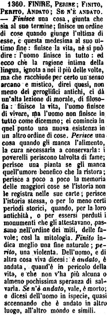| Finire, Perire; Finito, Perito, Andato; Se n’è andato - Finisce una cosa, giunta che sia al suo temine; finisce un ordine di cose quando giunge l'ultima di esse, e questa medesima al suo ultimo fine: finisce la vita, nè si può dire: l'uomo finisce in tutto: ed ecco che la ragione intima della lingua, ignota a noi il più delle volte, ma che racchiude per certo un senso arcano e mistico, direi quasi, non meno dei geroglifici antichi, ci dà un'alta lezione di morale, di filosofia: finisce la vita, l'uomo finisce di vivere, ma l'uomo non finisce in tutto come dicemmo; ei comincia in quel punto una nuova esistenza in un altro ordine di cose. Perisce una cosa quando gli manca l'alimento, la cura necessaria a conservarla: i poverelli periscono talvolta di fame; perisce una pianta se gli manca quell'umore benefico che la ristora; perisce a poco a poco la memoria delle maggiori cose se l'istoria non le registra nelle sue carte; perisce l'istoria stessa, o per lo meno certi periodi storici, quando, per la loro antichità, o per essersi perduti i monumenti che gli attestavano, passano nell'ordine dei miti, delle favole; così la mitologia. Finito indica meglio una fine naturale; perito, una violenta. Dell'uomo, e di altra cosa viva dicesi: è andato, è andata, quand'è in pericolo della vita, e che non v'ha più alcuna o almeno pochissima speranza di salvarla. Se n'è andato, vale, è morto; e dicesi dell'uomo in ispecie, quasi accennando che è andato in altro luogo, all'altro mondo e simili. [immagine] |