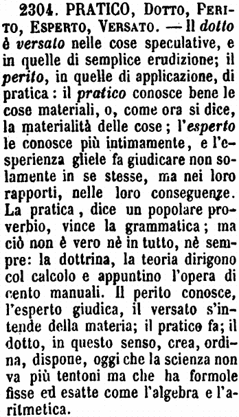 | Pratico, Dotto, Perito, Esperto, Versato - Il dotto è versato nelle cose speculative, e in quelle di semplice erudizione; il perito, in quelle di applicazione, di pratica: il pratico conosce bene le cose materiali, o, come ora si dice, la materialità delle cose; l'esperto le conosce più intimamente, e l'esperienza gliele fa giudicare non solamente in se stesse, ma nei loro rapporti, nelle loro conseguenze. La pratica, dice un popolare proverbio, vince la grammatica; ma ciò non è vero nè in tutto, nè sempre: la dottrina, la teoria dirigono col calcolo e appuntino l'opera di cento manuali. Il perito conosce, l'esperto giudica, il versato s'intende della materia; il pratico fa; il dotto, in questo senso, crea, ordina, dispone, oggi che la scienza non va più tentoni ma che ha formole fisse ed esatte come l'algebra e l'aritmetica. [immagine] |