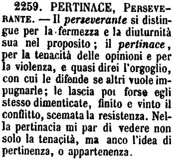 | Pertinace, Perseverante - Il perseverante si distingue per la fermezza e la diuturnità sua nel proposito; il pertinace, per la tenacità delle opinioni e per la violenza, e quasi direi l'orgoglio, con cui le difende se altri vuole impugnarle; le lascia poi forse egli stesso dimenticate, finito e vinto il conflitto, scemata la resistenza. Nella pertinacia mi par di vedere non solo la tenacità, ma anco l'idea di pertinenza, o appartenenza. [immagine] |