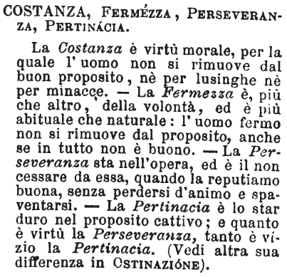 «La perseveranza è della volontà, e si manifesta più nel proposito che nell'atto. Una macchina a vapore, un orologio hanno continuità di moto, non perseveranza. La continuità è nel moto, scientificamente o teoricamente considerato, ed uniforme.» Capponi. [immagine] |