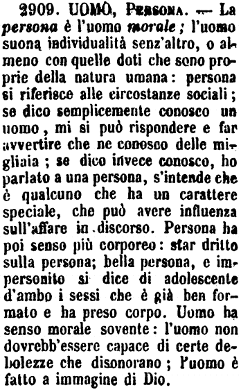 | Uomo, Persona - La persona è l'uomo morale; l'uomo suona individualità senz'altro, o almeno con quelle doti che sono proprie della natura umana: persona si riferisce alle circostanze sociali; se dico semplicemente conosco un uomo, mi si può rispondere e far avvertire che ne conosco delle migliaia; se dico invece conosco, ho parlato a una persona, s'intende che è qualcuno che ha un carattere speciale, che può avere influenza sull'affare in discorso. Persona ha poi senso più corporeo: star dritto sulla persona; bella persona, e impersonito si dice di adolescente d'ambo i sessi che è già ben formato e ha preso corpo. Uomo ha senso morale sovente; l'uomo non dovrebb'essere capace di certe debolezze che disonorano; l'uomo è fatto a immagine di Dio. [immagine] |