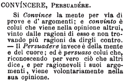 | Convincere, Persuadere - Si Convince la mente per via di prove e d'argomenti; e convinto è colui che viene nella opinione altrui, vinto dalle ragioni di esso e non trovando più ragioni da dirgli contro. - Il Persuadere invece è della mente e del cuore; ed è persuaso colui che, riconoscendo per vero ciò che altri dice, e per ragionevoli i suoi argomenti, viene volontariamente nella sua opinione. [immagine] |