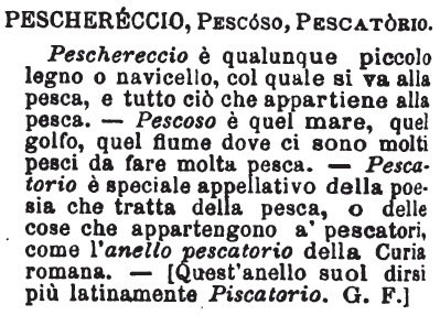 | Peschereccio, Pescoso, Pescatorio - Peschereccio è qualunque piccolo legno o navicello, col quale si va alla pesca, e tutto ciò che appartiene alla pesca. - Pescoso è quel mare, quel golfo, quel fiume dove ci sono molti pesci da fare molta pesca. - Pescatorio è speciale appellativo della poesia che tratta della pesca, o delle cose che appartengono a' pescatori, come l'anello pescatorio della Curia romana. - [Quest'anello suol dirsi più latinamente Piscatorio. G. F.] [immagine] |