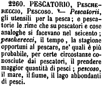 | Pescatorio, Peschereccio, Pescoso - Pescatorii, gli utensili per la pesca; e pescatorie le rime che su pescatori e cose analoghe si facevano nel seicento; pescherecci, il tempo, la stagione opportuni al pescare, ne' quali è più probabile, per certe circostanze conosciute dai pescatori, il prendere maggior quantità di pesci; pescoso, il mare, il fiume, il lago abbondanti di pesci. [immagine] |