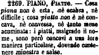 | Piano, Piatto - Cosa piana non è erta, nè scabra, nè difficile; cosa piatta non è nè concava, nè convessa, nè tanto meno acuminata: i piatti, malgrado il nome, sono però concavi a una loro maniera particolare, dovendo contenere minestra e salse. [immagine] |