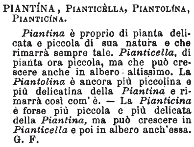 | Piantina, Pianticella, Piantolina, Pianticina - Piantina è proprio di pianta delicata e piccola di sua natura e che rimarrà sempre tale. Pianticella, di pianta ora piccola, ma che può cresccere anche in albero altissimo. La Piantolina è ancora più piccolina e più delicatina della Piantina e rimarrà così com'è. - La Pianticina è forse più piccola e più delicata della Piantina, ma può crescere in Pianticella e poi in albero anch'essa. G. F. [immagine] |