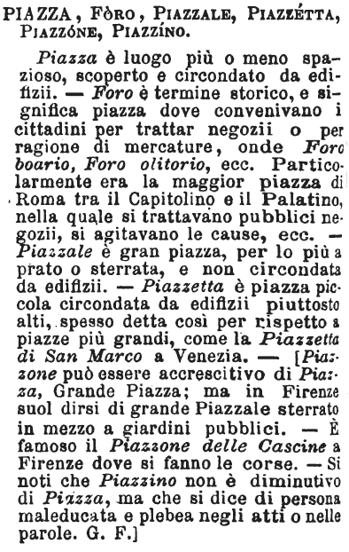 | Piazza, Foro, Piazzale, Piazzetta, Piazzone, Piazzino - Piazza è luogo più o meno spazioso, scoperto e circondato da edifizii. - Foro è termine storico, e significa piazza dove convenivano i cittadini per trattar negozii o per ragione di mercature, onde Foro boario, Foro olitorio, ecc. Particolarmente era la maggior piazza di Roma tra il Capitolino e il Palatino, nella quale si trattavano pubblici negozii, si agitavano le cause, ecc. - Piazzale è gran piazza, per lo più a prato o sterrata, e non circondata da edifizii. - Piazzetta è piazza piccola circondata da edifizii piuttosto alti, spesso detta così per rispetto a piazze più grandi, come la Piazzetta di San Marco a Venezia. - [Piazzone può essere accrescitivo di Piazza, Grande Piazza; ma in Firenze suol dirsi di grande Piazzale sterrato in mezzo a giardini pubblici. - E' famoso il Piazzone delle Cascine a Firenze dove si fanno le corse. - Si noti che Piazzino non è diminutivo di Piazza, ma che si dice di persona maleducata e plebea negli atti o nelle parole. G. F.] [immagine] |