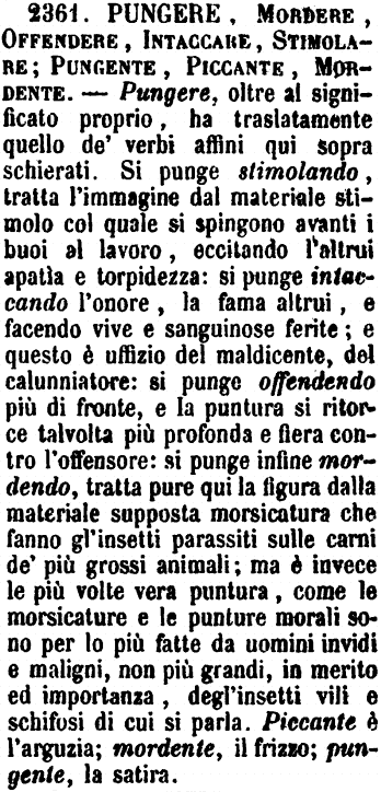 | Pungere, Mordere, Offendere, Intaccare, Stimolare; Pungente, Piccante, Mordente - Pungere, oltre al significato proprio, ha traslatamente quello de' verbi affini qui sopra schierati. Si punge stimolando, tratta l'immagine dal materiale stimolo col quale si spingono avanti i buoi al lavoro, eccitando l'altrui apatìa e torpidezza: si punge intaccando l'onore, la fama altrui, e facendo vive e sanguinose ferite; e questo è uffizio del maldicente, del calunniatore: si punge offendendo più di fronte, e la puntura si ritorce talvolta più profonda e fiera contro l'offensore: si punge infine mordendo, tratta pure qui la figura dalla materiale supposta morsicatura che fanno gl'insetti parassiti sulle carni de' più grossi animali; ma è invece le più volte vera puntura, come le morsicature e le punture morali sono per lo più fatte da uomini invidi e maligni, non più grandi, in merito ed importanza, degl'insetti vili e schifosi di cui si parla. Piccante è l'arguzia; mordente, il frizzo; pungente, la satira. [immagine] |