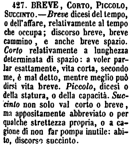 | Breve, Corto, Piccolo, Succinto - Breve dicesi del tempo, o dell'affare, relativamente al tempo che occupa; discorso breve, breve cammino, e anche breve spazio. Corto relativamente a lunghezza determinata di spazio: a voler parlar esattamente, vita corta, secondo me, è mal detto, mentre meglio può dirsi vita breve. Piccolo, dicesi o della statura, o della capacità. Succinto non solo val corto o breve, ma appositamente abbreviato o per qualche strettezza propria, o a cagione di non far pompa inutile: abito, discorso succinto. [immagine] |
