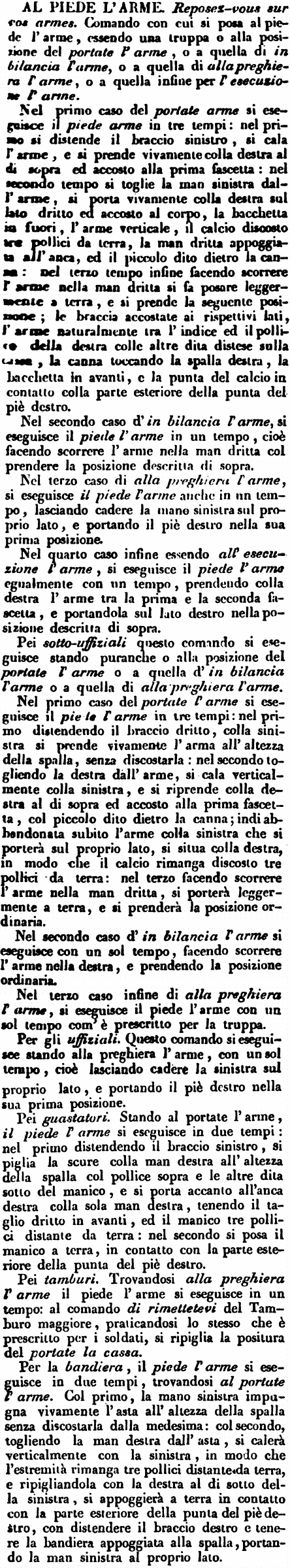 Nel primo caso del portate arme si eseguisce il piede arme in tre tempi: nel primo si distende il braccio sinistro, si cala l'arme, e si prende vivamente colla destra al di sopra ed accosto alla prima fascetta: nel secondo tempo si toglie la man sinistra dall'arme, si porta vivamente colla destra sul lato dritto ed accosto al corpo, la bacchetta in fuori, l'arme verticale, il calcio discosto tre pollici da terra, la man dritta appoggiata all'anca, ed il piccolo dito dietro la canna: nel terzo tempo infine facendo scorrere l'arme nella man dritta si fa posare leggermente a terra, e si prende la seguente posizione; le braccia accostate ai rispettivi lati, l'arme naturalmente tra l'indice ed il pollice della destra colle altre dita distese sulla canna, la canna toccando la spalla destra, la bacchetta in avanti, e la punta del calcio in contatto colla parte esteriore della punta del piè destro. Nel secondo caso d'in bilancia l'arme, si eseguisce il piede l'arme in un tempo, cioè facendo scorrere l'arme nella man dritta col prendere la posizione descritta di sopra. Nel terzo caso di alla preghiera l'arme, si eseguisce il piede l'arme anche in un tempo, lasciando cadere la mano sinistra sul proprio lato, e portando il piè destro nella sua prima posizione. Nel quarto caso infine essendo all'esecuzione l'arme, si eseguisce il piede l'arme egualmente con un tempo, prendendo colla destra l'arme tra la prima e la seconda fascetta, e portandola sul lato destro nella posizione descritta di sopra. Pei sotto-uffiziali questo comando si eseguisce stando puranche o alla posizione del portate l'arme o a quella d'in bilancia l'arme o a quella di alla preghiera l'arme. Nel primo caso del portate l'arme si eseguisce il piede l'arme in tre tempi: nel primo distendendo il braccio dritto, colla sinistra si prende vivamente l'arma all'altezza della spalla, senza discostarla: nel secondo togliendo la destra dall'arme, si cala verticalmente colla sinistra, e si riprende colla destra al di sopra ed accosto alla prima fascetta, col piccolo dito dietro la canna; indi abbandonata subito l'arme colla sinistra che si porterà sul proprio lato, si situa colla destra, in modo che il calcio rimanga discosto tre pollici da terra: nel terzo facendo scorrere l'arme nella man dritta, si porterà leggermente a terra, e si prenderà la posizione ordinaria. Nel secondo caso d'in bilancia l'arme si eseguisce con un sol tempo, facendo scorrere l'arme nella destra, e prendendo la posizione ordinaria. Nel terzo caso infine di alla preghiera l'arme, si eseguisce il piede l'arme con un sol tempo com'è prescritto per la truppa. Per gli uffiziali. Questo comando si eseguisce stando alla preghiera l'arme, con un sol tempo, cioè lasciando cadere la sinistra sul proprio lato, e portando il piè destro nella sua prima posizione. Pei guastatori. Stando al portate l'arme, il piede l'arme si eseguisce in due tempi: nel primo distendendo il braccio sinistro, si piglia la scure colla man destra all'altezza della spalla col pollice sopra e le altre dita sotto del manico, e si porta accanto all'anca destra colla sola man destra, tenendo il taglio dritto in avanti, ed il manico tre pollici distante da terra: nel secondo si posa il manico a terra, in contatto con la parte esteriore della punta del piè destro. Pei tamburi. Trovandosi alla preghiera l'arme il piede l'arme si eseguisce in un tempo: al comando di rimettetevi del Tamburo maggiore, praticandosi lo stesso che è prescritto per i soldati, si ripiglia la positura del portate la cassa. Per la bandiera, il piede l'arme si eseguisce in due tempi, trovandosi al portate l'arme. Col primo, la mano sinistra impugna vivamente l'asta all'altezza della spalla senza discostarla dalla medesima: col secondo, togliendo la man destra dall'asta, si calerà verticalmente con la sinistra, in modo che l'estremità rimanga tre pollici distante da terra, e ripigliandola con la destra al di sotto della sinistra, si appoggierà a terra in contatto con la parte esteriore della punta del piè destro, con distendere il braccio destro e tenere la bandiera appoggiata alla spalla, portando la man sinistra al proprio lato. [immagine] |