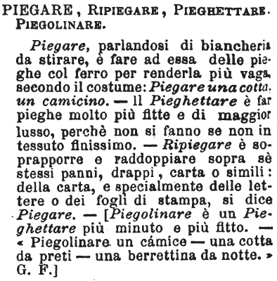 | Piegare, Ripiegare, Pieghettare, Piegolinare - Piegare, parlandosi di biancheria da stirare, è fare ad essa delle pieghe col ferro per renderla più vaga, secondo il costume: Piegare una cotta, un camicino. - Il Pieghettare è far pieghe molto più fitte e di maggior lusso, perchè non si fanno se non in tessuto finissimo. - Ripiegare è soprapporre e raddoppiare sopra sè stessi panni, drappi, carta o simili: della carta, e specialmente delle lettere o dei fogli di stampa, si dice Piegare. - [Piegolinare è un Pieghettare più minuto e più fitto. - « Piegolinare un cámice - una cotta da preti - una berrettina da notte. » G. F.] [immagine] |