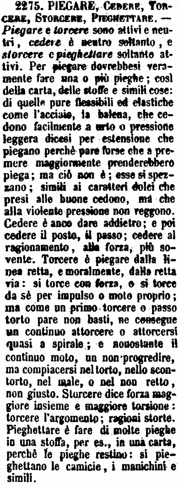 | Piegare, Cedere, Torcere, Storcere, Pieghettare - Piegare e torcere sono attivi e neutri, cedere è neutro soltanto, e storcere e pieghettare soltanto attivi. Per piegare dovrebbesi veramente fare una o più pieghe; così della carta, delle stoffe e simili cose: di quelle pure flessibili ed elastiche come l'acciaio, la balena, che cedono facilmente a urto o pressione leggera dicesi per estensione che piegano perchè pare forse che a premere maggiormente prenderebbero piega; ma ciò non è; esse si spezzano; simili ai caratteri dolci che presi alle buone cedono, ma che alla violente pressione non reggono. Cedere è anco dare addietro; e poi cedere il posto, il passo; cedere al ragionamento, alla forza, più sovente. Torcere è piegare dalla linea retta, e moralmente, dalla retta via: si torce con forza, o si torce da sè per impulso o moto proprio; ma come un primo torcere o passo torto pare non basti, ne consegue un continuo attorcere o attorcersi quasi a spirale; e nonostante il continuo moto, un non progredire, ma compiacersi nel torto, nello scontorto, nel male, o nel non retto, non giusto. Storcere dice forza maggiore insieme e maggiore torsione: torcere l'argomento; ragioni storte. Pieghettare è fare di molte pieghe in una stoffa, per es., in una carta, perchè le pieghe restino: si pieghettano le camicie, i manichini e simili. [immagine] |
