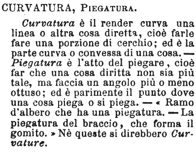 | Curvatura, Piegatura - Curvatura è il render curva una linea o altra cosa diretta, cioè farle fare una porzione di cerchio; ed è la parte curva o convessa di una cosa. - Piegatura è l'atto del piegare, cioè far che una cosa diritta non sia più tale, ma faccia un angolo più o meno ottuso; ed è parimente il punto dove una cosa piega o si piega. - «Ramo d'albero che ha una piegatura. - La piegatura del braccio, che forma il gomito.» Nè queste si direbbero Curvature. [immagine] |