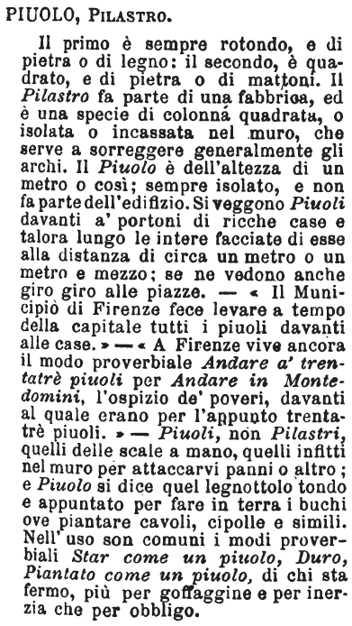| Piuolo, Pilastro - Il primo è sempre rotondo, e di pietra o di legno: il secondo, è quadrato, e di pietra o di mattoni. Il Pilastro fa parte di una fabbrica, ed è una specie di colonna quadrata, o isolata o incassata nel muro, che serve a sorreggere generalmente gli archi. Il Piuolo è dell'altezza di un metro o così; sempre isolato, e non fa parte dell'edifizio. Si veggono Piuoli davanti a' portoni di ricche case e talora lungo le intere facciate di esse alla distanza di circa un metro o un metro e mezzo; se ne vedono anche giro giro alle piazze. - «Il Municipio di Firenze fece levare a tempo della capitale tutti i piuoli davanti alle case.» - «A Firenze vive ancora il modo proverbiale Andare a' trentatrè piuoli per Andare in Montedomini, l'ospizio de' poveri, davanti al quale erano per l'appunto trentatrè piuoli.» - Piuoli, non Pilastri, quelli delle scale a mano, quelli infitti nel muro per attaccarvi panni o altro; e Piuolo si dice quel legnottolo tondo e appuntato per fare in terra i buchi ove piantare cavoli, cipolle e simili. Nell'uso son comuni i modi proverbiali Star come un piuolo, Duro, Piantato come un piuolo, di chi sta fermo, più per goffaggine e per inerzia che per obbligo. [immagine] |