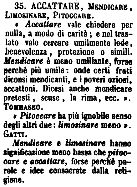 «Pitoccare ha più ignobile senso degli altri due: limosinare meno». Gatti. Mendicare e limosinare hanno significazione meno bassa che pitoccare e accattare, forse perchè parole e idee consacrate dalla religione. [immagine] |