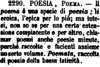 | Poesia, Poema - Il poema è una specie di poesia; la eroica, l'epica per lo più; ma intesi, non so se per una certa estensione compiacente o per altro, chiamar poemi anche poesie minute, purchè raccolte e facienti assieme un certo volume. Poemata, raccolta di poesie della bassa latinità. [immagine] |