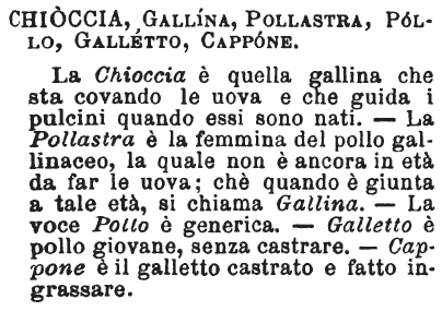 | Chioccia, Gallina, Pollastra, Pollo, Galletto, Cappone - La Chioccia è quella gallina che sta covando le uova e che guida i pulcini quando essi sono nati. - La Pollastra è la femmina del pollo gallinaceo, la quale non è ancora in età da far le uova; chè quando è giunta a tale età, si chiama Gallina. - La voce Pollo è generica. - Galletto è pollo giovane, senza castrare. - Cappone è il galletto castrato e fatto ingrassare. [immagine] |