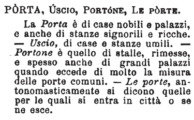 | Porta, Uscio, Portone, Le porte - La Porta è di case nobili e palazzi, e anche di stanze signorili e ricche. - Uscio, di case e stanze umili. - Portone è quello di stalle, rimesse, e spesso anche di grandi palazzi quando eccede di molto la misura delle porte comuni. - Le porte, antonomasticamente si dicono quelle per le quali si entra in città o se ne esce. [immagine] |