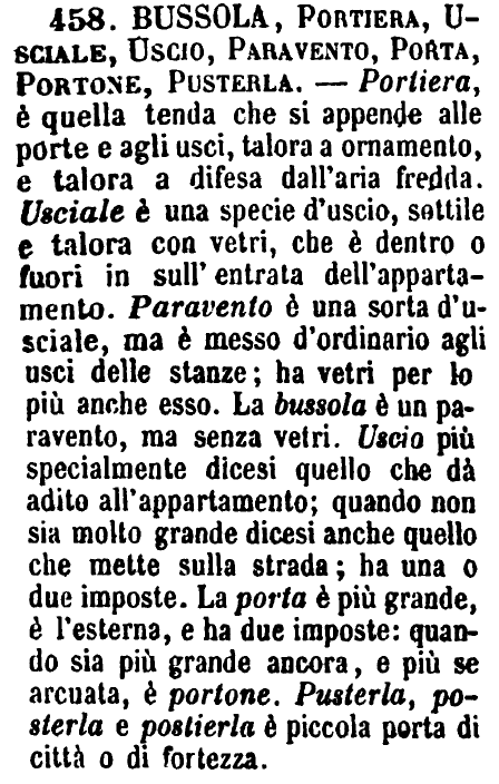 | Bussola, Portiera, Usciale, Uscio, Paravento, Porta, Portone, Pusterla - Portiera, è quella tenda che si appende alle porte e agli usci, talora a ornamento, e talora a difesa dall'aria fredda. Usciale è una specie d'uscio, settile e talora con vetri, che è dentro o fuori in sull'entrata dell'appartamento. Paravento è una sorta d'usciale, ma è messo d'ordinario agli usci delle stanze; ha vetri per lo più anche esso. La bussola è un paravento, ma senza vetri. Uscio più specialmente dicesi quello che dà adito all'appartamento; quando non sia molto grande dicesi anche quello che mette sulla strada; ha una o due imposte. La porta è più grande, è l'esterna, e ha due imposte: quando sia più grande ancora, e più se arcuata, è portone. Pusterla, posterla e postierla è piccola porta di città o di fortezza. [immagine] |