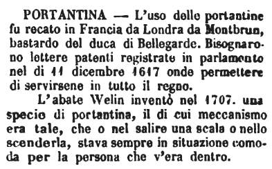 Portantina - L'uso delle portantine fu recato in Francia da Londra da Montbrun, bastardo del duca di Bellegarde. Bisognarono lettere patenti registrate in parlamento nel dì 11 dicembre 1617 onde permettere di servirsene in tutto il regno.