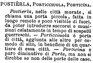 | Postierla, Porticciuola, Porticina - Postierla, nelle città murate, si chiama una porta piccola, fatta in luogo remoto e poco visibile di fuori, da poter introdurre soccorsi e munizioni celatamente in tempo di sospetti guerreschi. - Porticciuola è porta di città, aggiunta alle altre per comodo di sito, in beneficio di un quartiere di essa città. - Porticina è puro diminutivo di Porta, ma non si direbbe se non delle porte delle case. [immagine] |