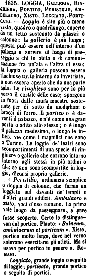 | Loggia, Galleria, Ringhiera, Portico, Peristilio, Ambulacro, Xisto, Loggiato, Porticato - Loggia è sito più o meno vasto, quadro o quadrilungo, coperto da un tetto sostenuto da pilastri o colonne: la galleria è più lunga; questa può essere nell'interno d'un palazzo e servire di luogo di passeggio a chi lo abita o di comunicazione fra un'ala e l'altra di esso; la loggia o galleria possono essere rinchiuse tutto intorno da invetriate, o non essere aperte che da una parte sola. Le ringhiere sono per lo più verso il cortile delle case; sporgono in fuori dalle mura maestre sostenute per di sotto da modiglioni o bracci di ferro. Il portico o è davanti il palazzo, e n'è come una gran porta o adito allo stesso; o è lungo il palazzo medesimo, o lungo le intiere vie come i magnifici che sono a Torino. Le loggie de' teatri sono scompartimenti di una specie di ringhiere o gallerie che corrono intorno intorno agli stessi in più ordini o file; se non sono scompartite in loggie, diconsi proprio gallerie.