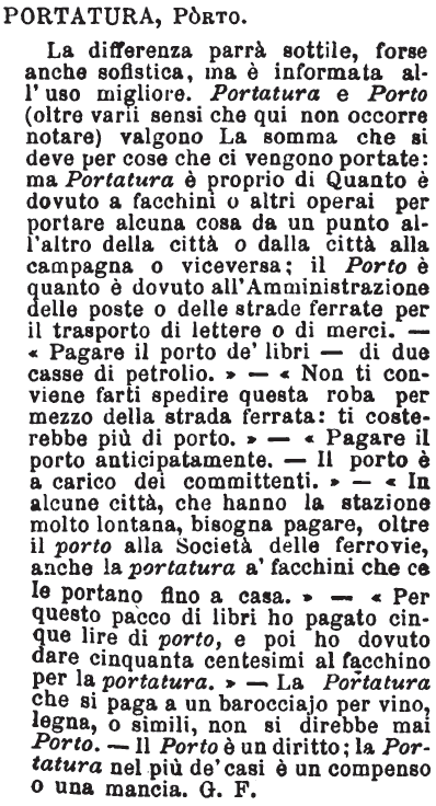 | Portatura, Porto - La differenza parrà sottile, forse anche sofistica, ma è informata all'uso migliore. Portatura e Porto (oltre varii sensi che qui non occorre notare) valgono La somma che si deve per cose che ci vengono portate: ma Portatura è proprio di Quanto è dovuto a facchini o altri operai per portare alcuna cosa da un punto all'altro della città o dalla città alla campagna o viceversa; il Porto è quanto è dovuto all' Amministrazione delle poste o delle strade ferrate per il trasporto di lettere o di merci. - «Pagare il porto de' libri - di due casse di petrolio». - «Non ti conviene farti spedire questa roba per mezzo della strada ferrata: ti costerebbe più di porto.» - «Pagare il porto anticipatamente. - Il porto è a carico dei committenti.» - «In alcune città, che hanno la stazione molto lontana, bisogna pagare, oltre il porto alla Società delle ferrovie, anche la portatura a' facchini che ce le portano fino a casa.» - «Per questo pacco di libri ho pagato cinque lire di porto, e poi ho dovuto dare cinquanta centesimi al facchino per la portatura.» - La Portatura che si paga a un barocciajo per vino, legna, o simili, non si direbbe mai Porto. - Il Porto è un diritto; la Portatura nel più de' casi è un compenso o una mancia. G.F. [immagine] |